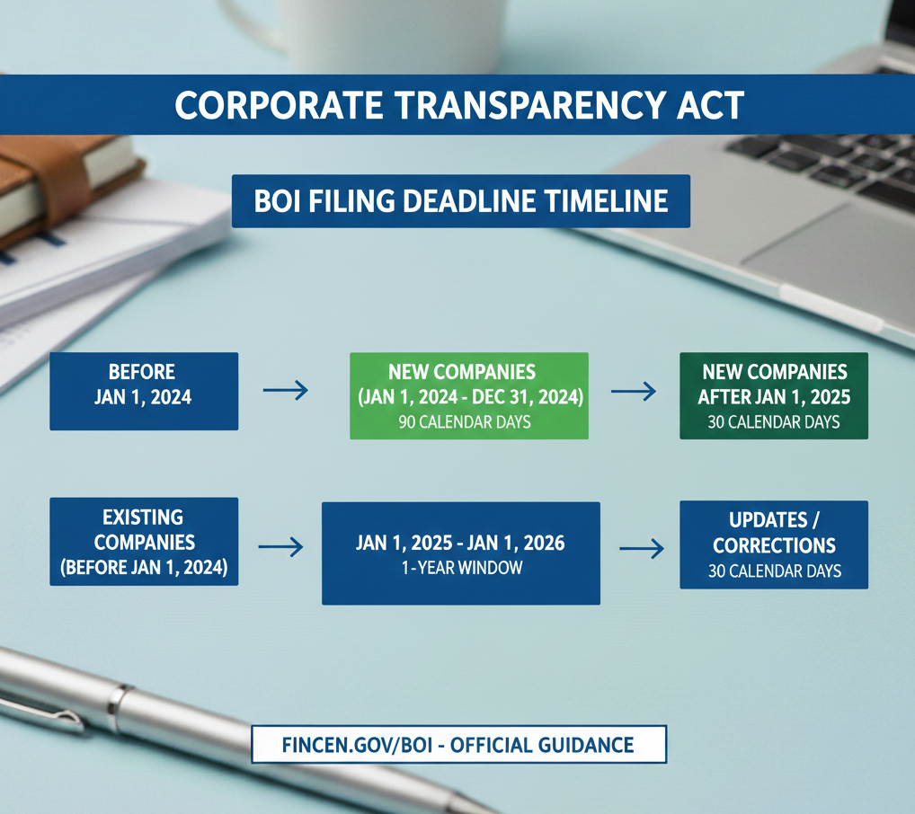 The Beneficial Ownership Information (BOI) reporting deadline under the Corporate Transparency Act depends on when the company was formed.