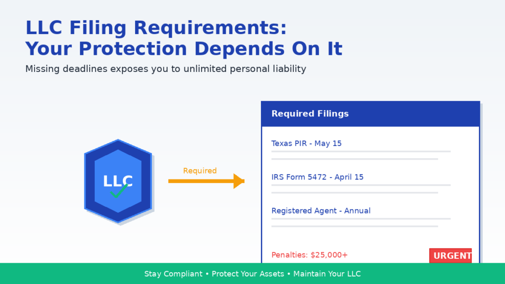 States do not “forget” about missing reports. They track deadlines automatically. If you do not file, your LLC can lose good standing (your business is no longer officially compliant). If the problem continues, Texas can move toward forfeiture (the state removes your company’s right to operate and weakens key legal protections).