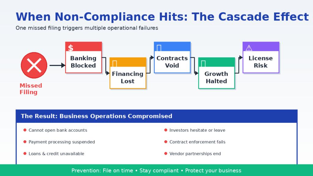 Personal liability is the long-term risk. The immediate damage is operational. When an LLC loses good standing or enters forfeiture, everyday business functions can start failing.